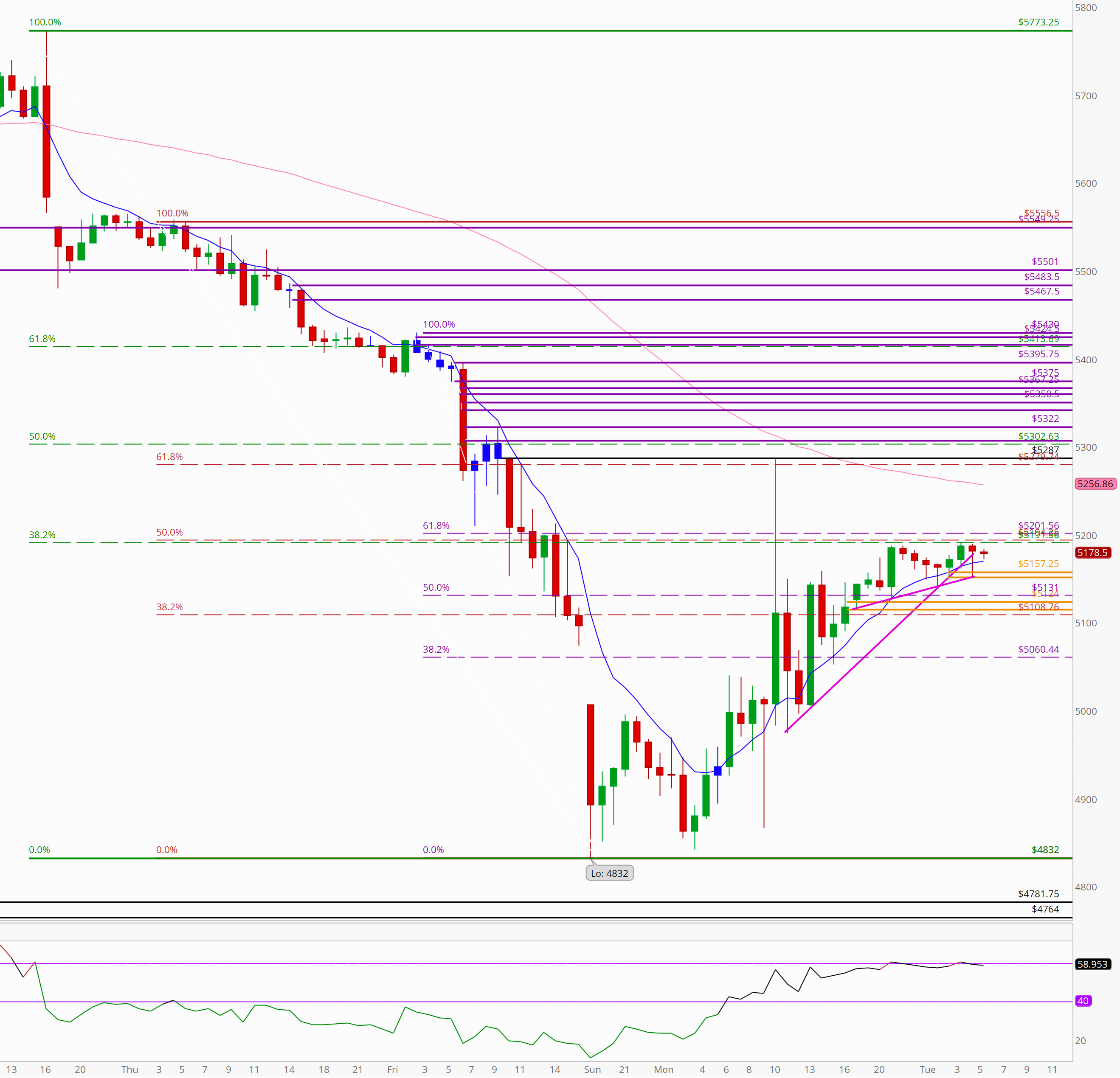 We are at three significant Fib retracement levels (green,red,purple) from critical highs before selling resumed. While we don’t blindly trade Fib levels, ever… some traders will be looking at this retracement(s) from the low as a potential selling point. Above 5202 clears this but we are lined up now.