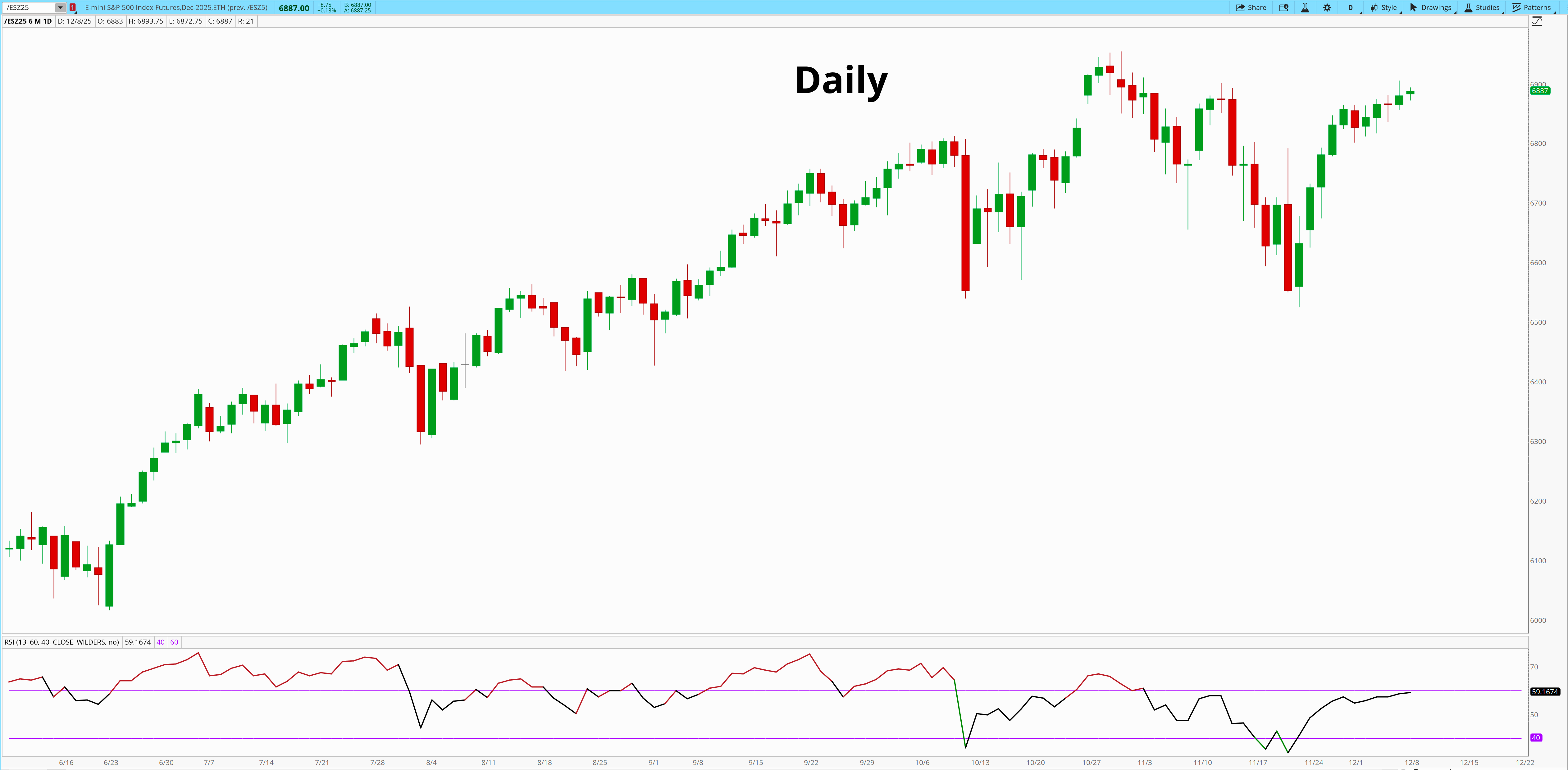 RSI continues to hover under 60. Close enough to tease, not strong enough to declare anything. Until this resolves the daily is stuck between two competing forces: buyers defending every shallow pullback, and sellers defending the same 6900 above.