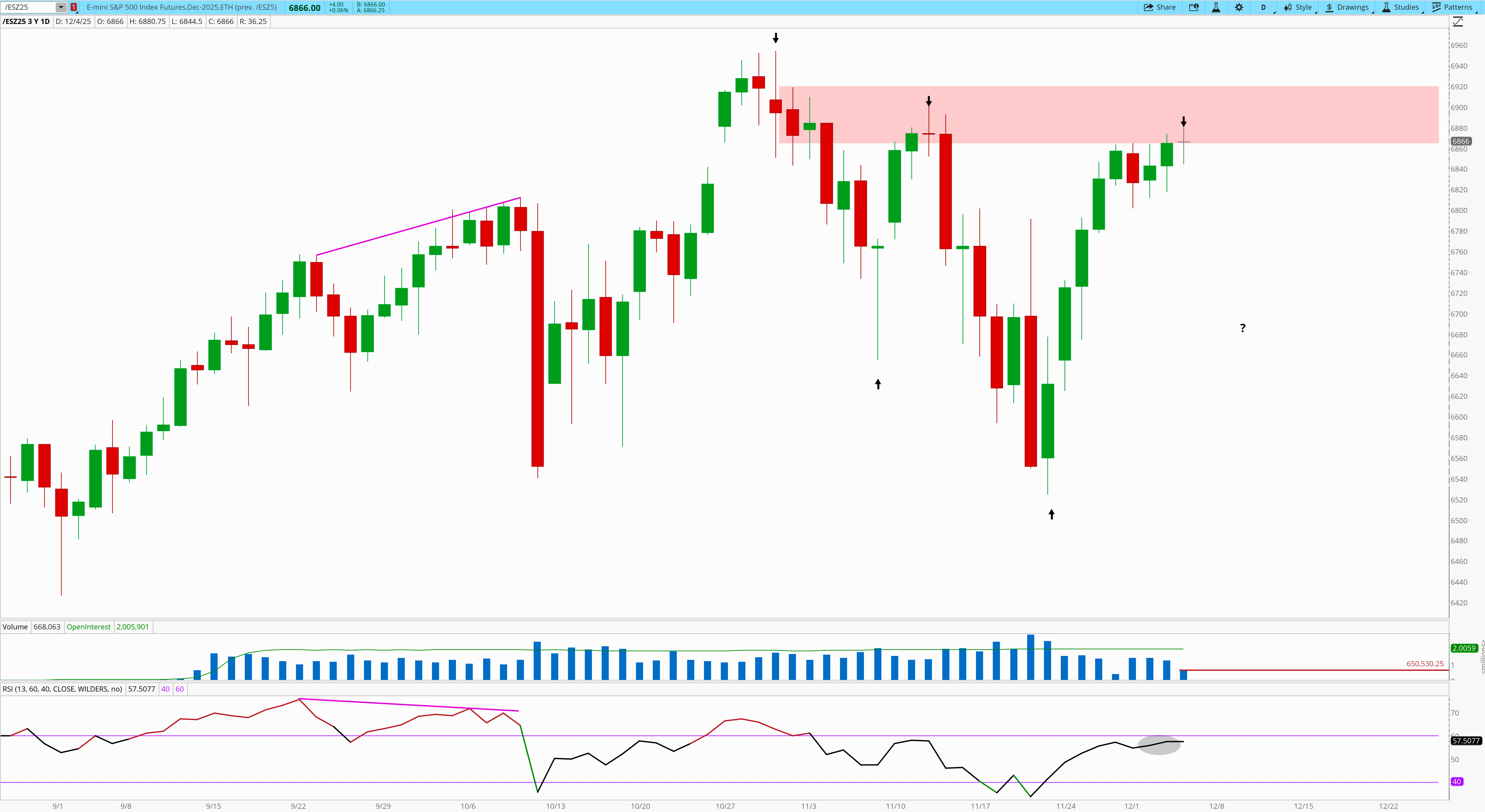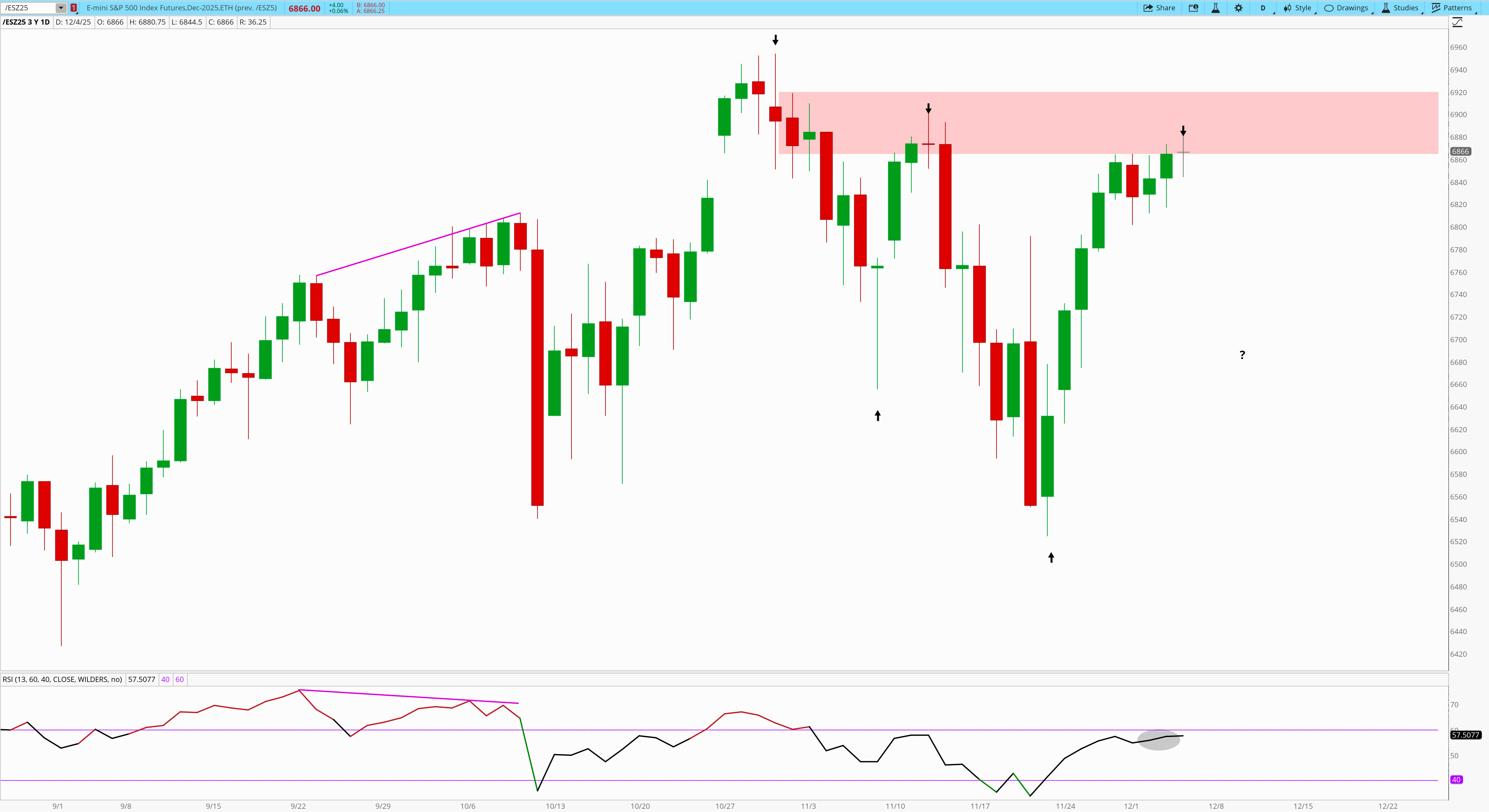 So we do not have the same divergence backdrop, but we do have a liquidity vacuum underneath and that heavy band above. Trading is thin because the bigger players see the same thing. CTAs, hedge funds, all the usual suspects are basically aligned:
