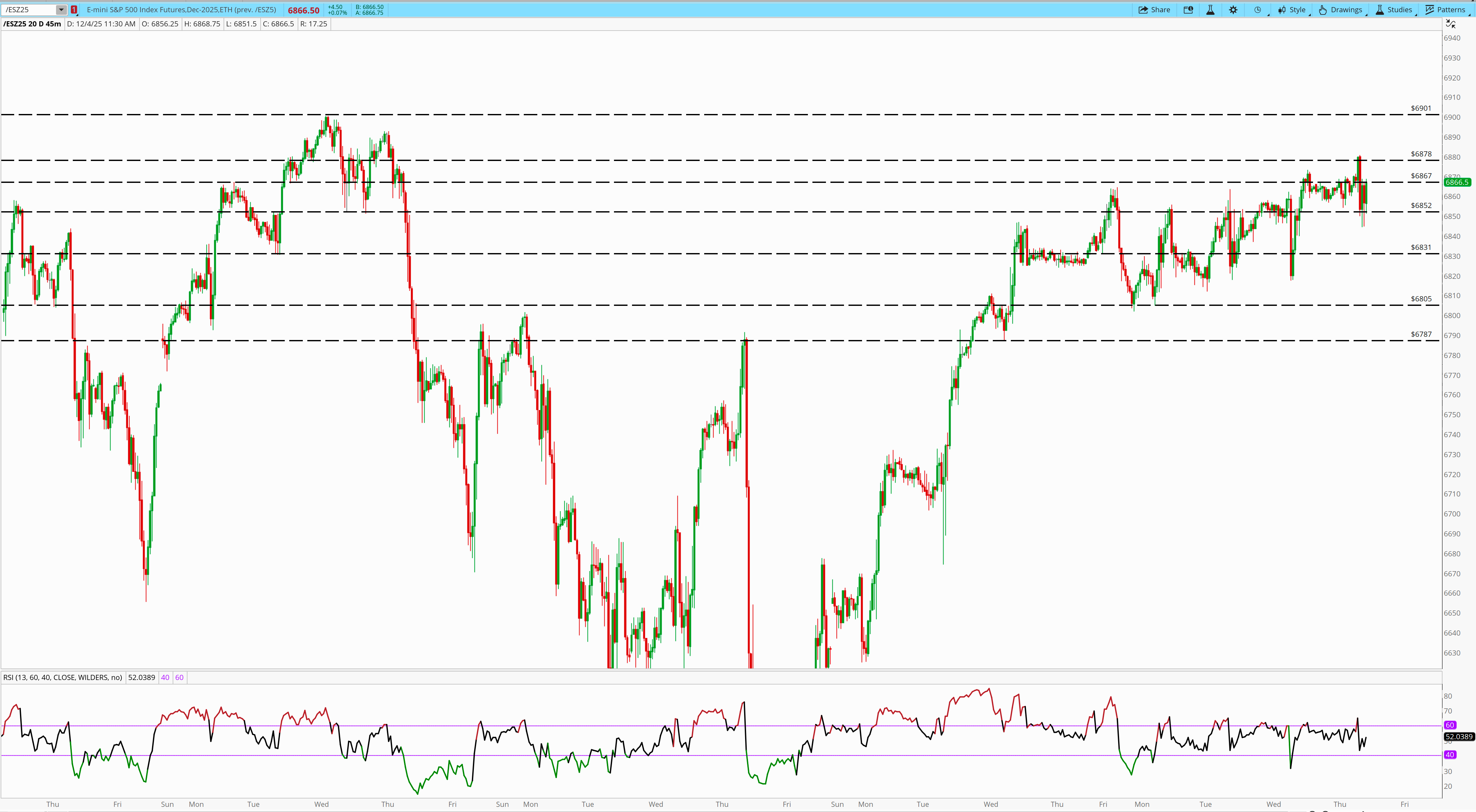 Repeated pushes into 6852, 6867 and 6878 keep failing to extend. These are classic failed breakouts inside hinge compression, not trend.