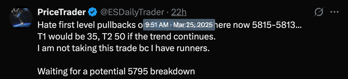 I commented the issues I saw with taking the trade noting it was a first level pullback on a relatively large bull run since Friday, but it was an opportunity I may have taken if we didn’t have runners from much lower price points.