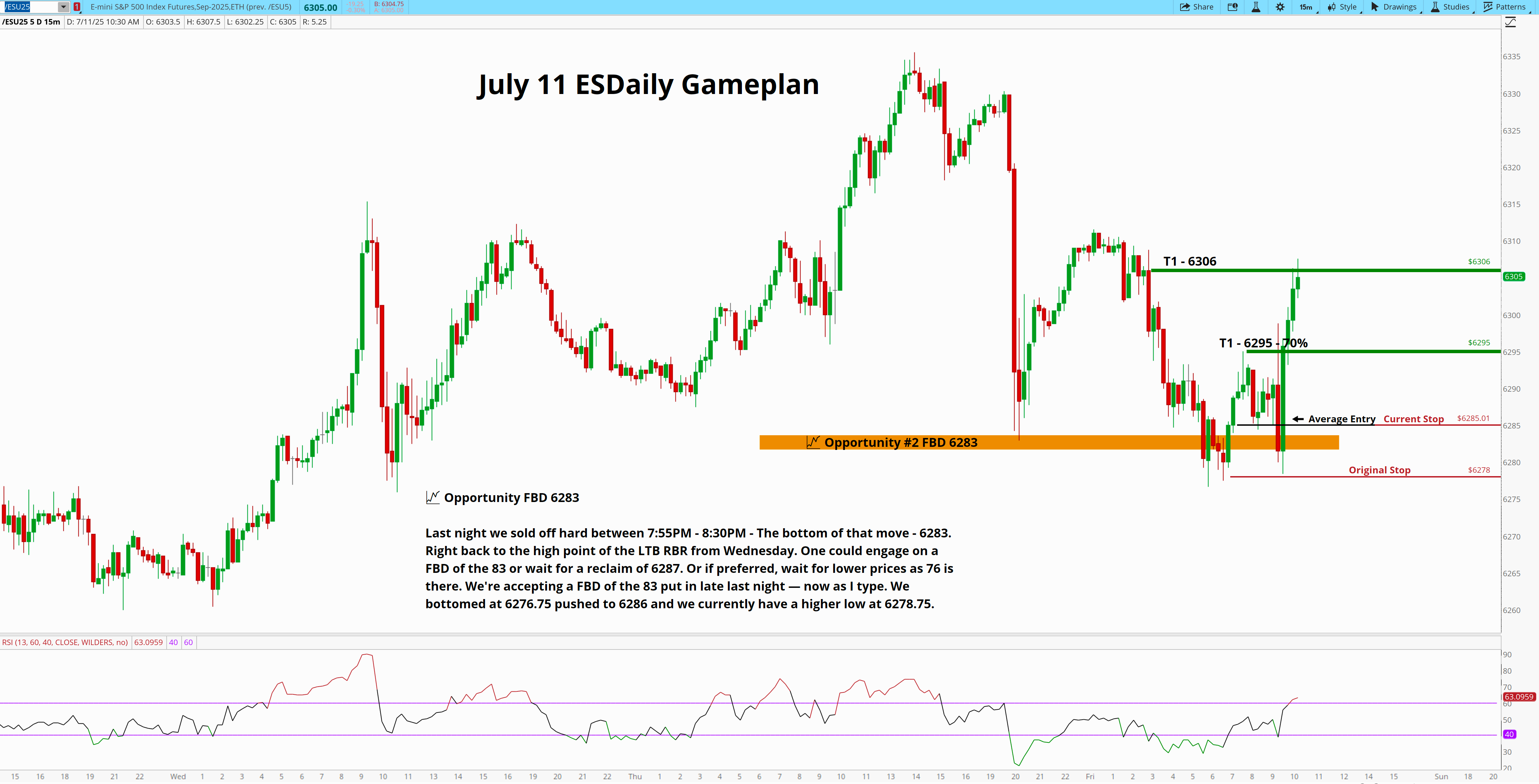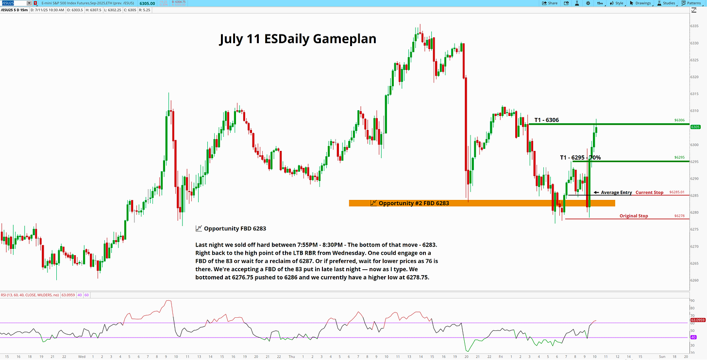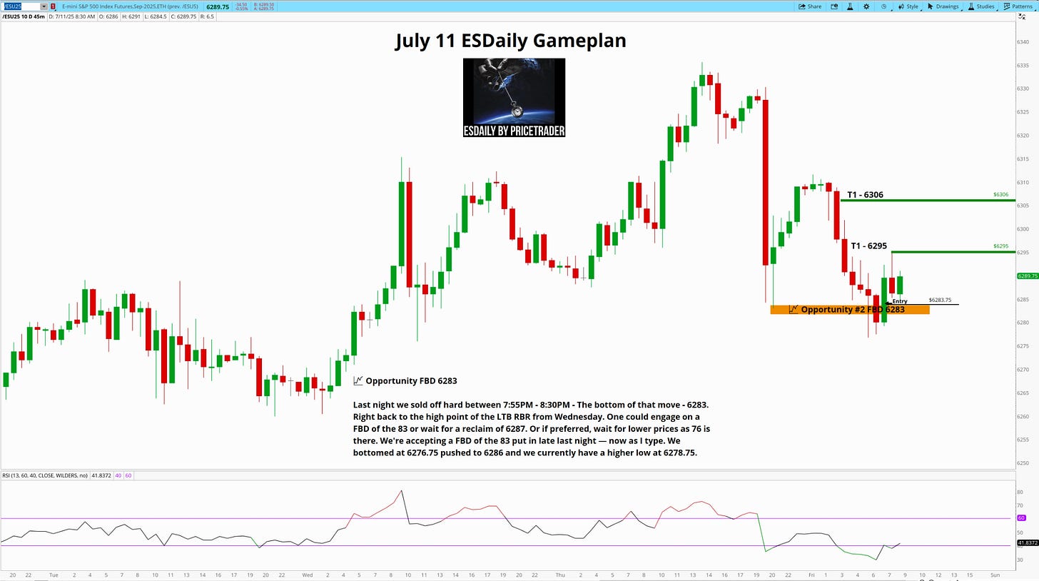 Last night we sold off hard between 7:55PM - 8:30PM - The bottom of that move - 6283. Right back to the high point of the LTB RBR from Wednesday. One could engage on a FBD of the 83 or wait for a reclaim of 6287. Or if preferred, wait for lower prices as 76 is there. We're accepting a FBD of the 83 put in late last night — now as I type. We bottomed at 6276.75 pushed to 6286 and we currently have a higher low at 6278.75.