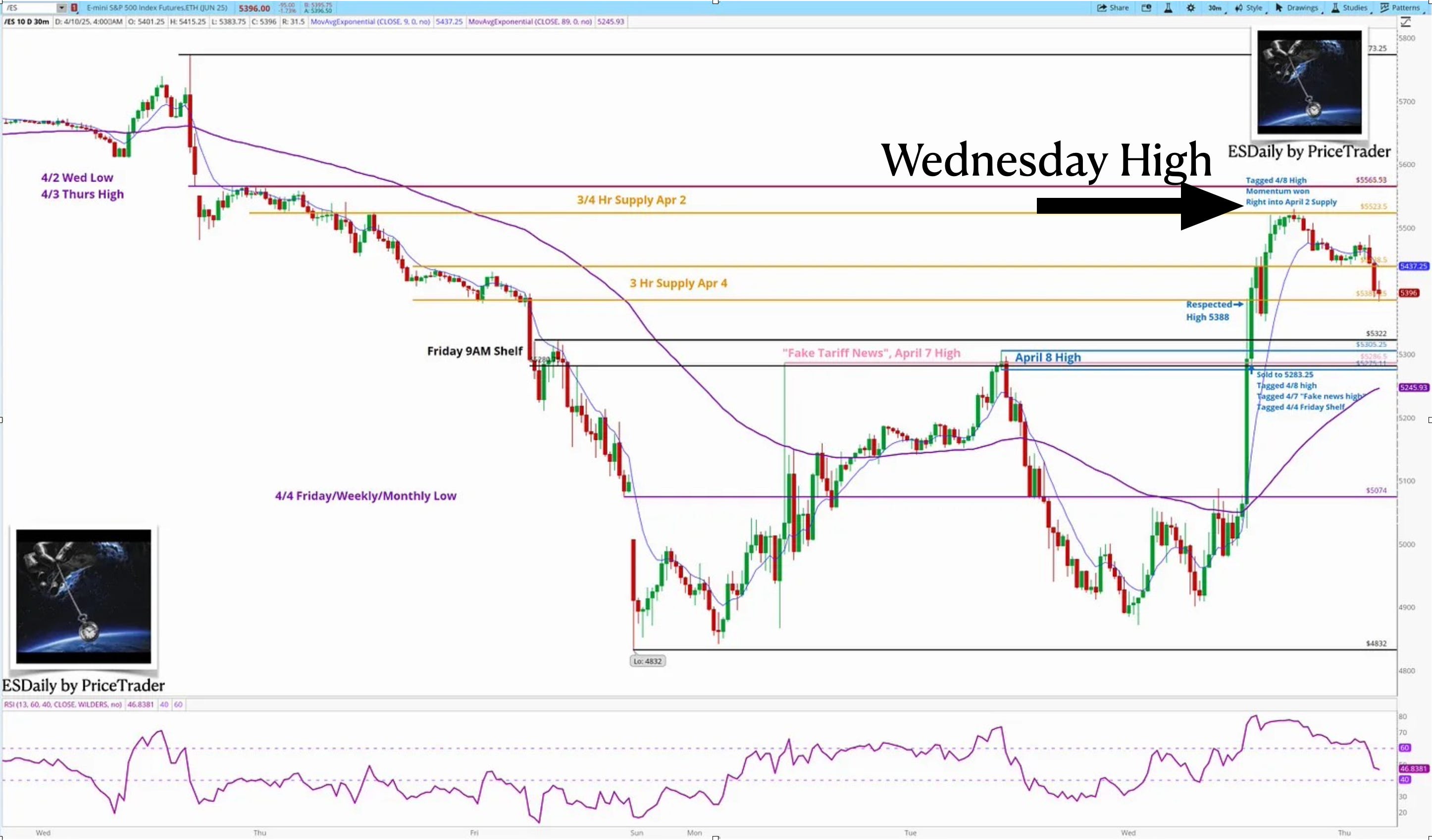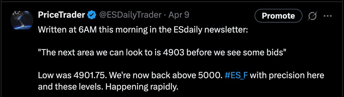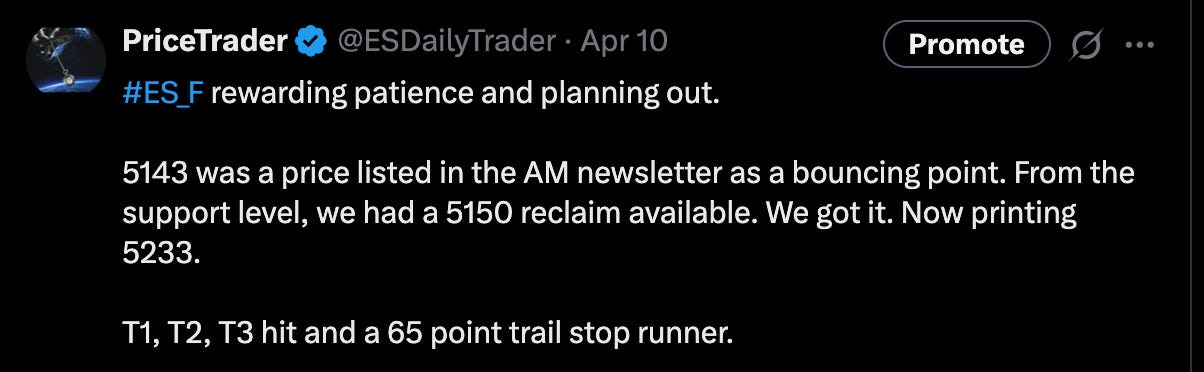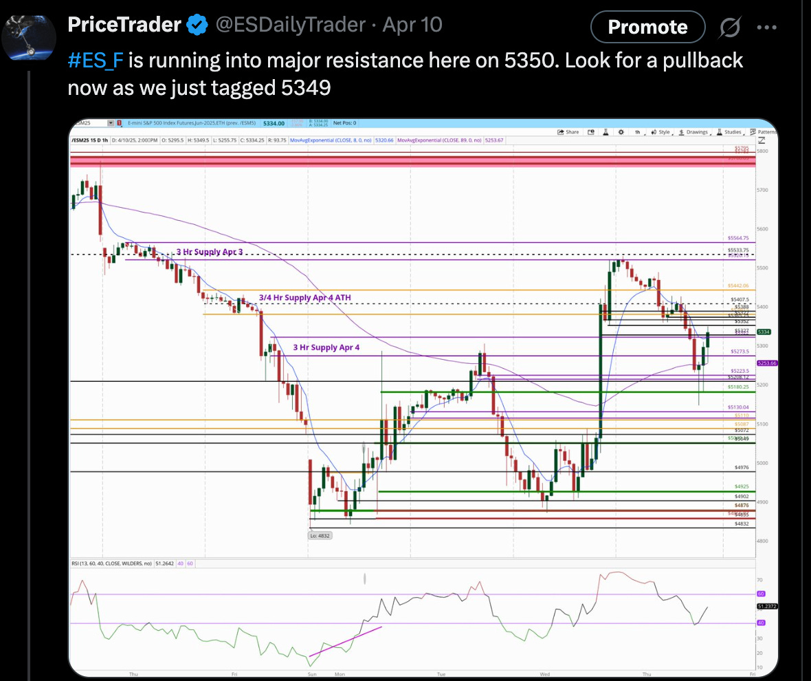 T1 and T2 were hit quickly and the rally of the year ensued. Within 45 minutes ES went from -4% territory to +3.5% territory. I did what I always do in a risk reduction effort — Take profits according to a pre-planned strategy. 75% off at the first target, 20% off at T2. I left a very small runner as price ran to 5286 from our entry. This was the most violent squeeze I can remember being a apart of, as Tariff news hit the wires shortly after the entry. As traders scrambled to get on board chasing price away from the level track back opportunity, we already had 20 points locked in on T1 and 74 points on T2. That emotion pushed us into key supple.
