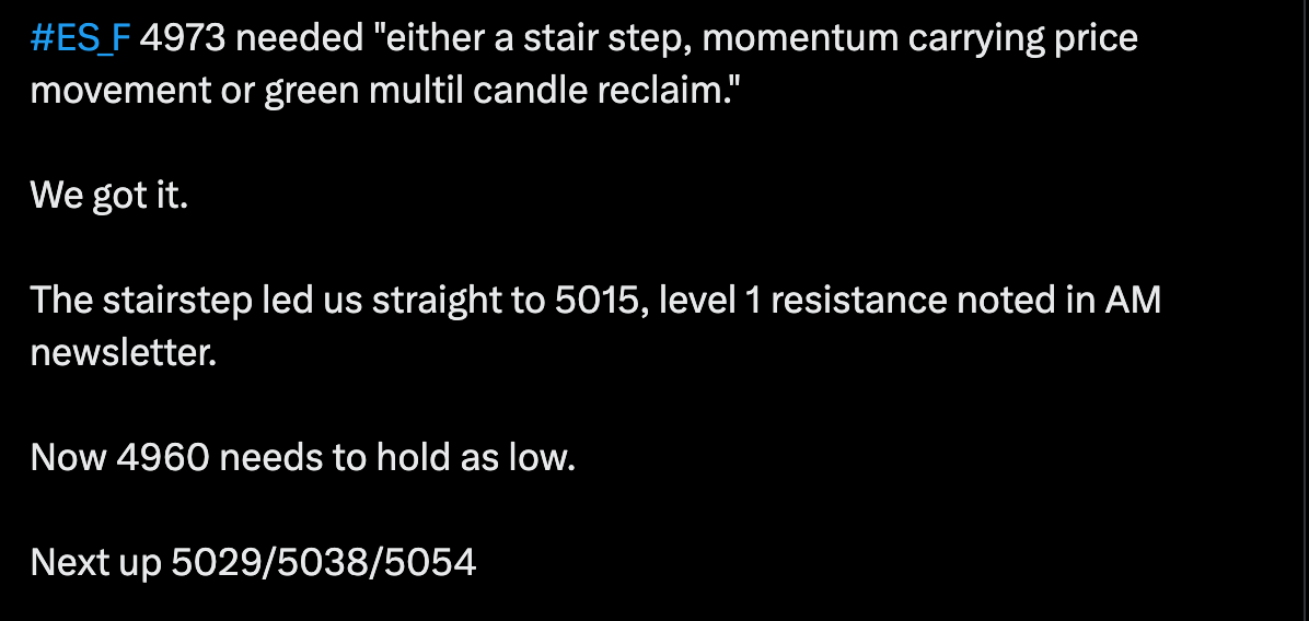 I may entertain failed breakdown of 4969 into 4940 if we get there and it’s a clean bounce. The next area we can look to is 4903 before we see some bids. But again, no knife catching, waiting for acceptance.