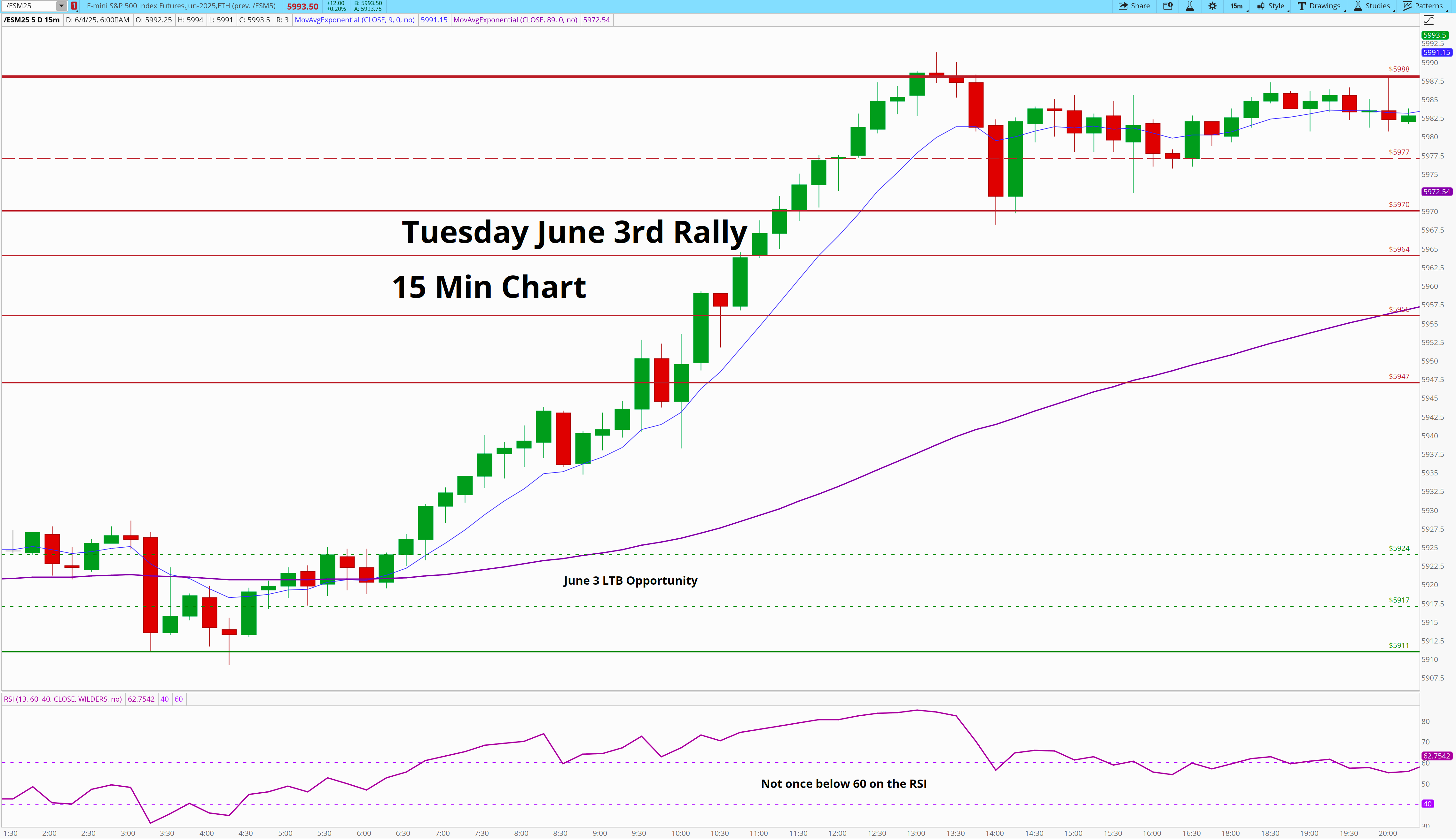 Late in the session, we tagged the the upper supply zone — 5988–5995. RSI was 84 — This is the point where we finally stalled. The pullback from 5991 to 5952 was the biggest of the day — just 39 points. That’s it. And even then, the response was fast. That’s the definition of trend integrity.