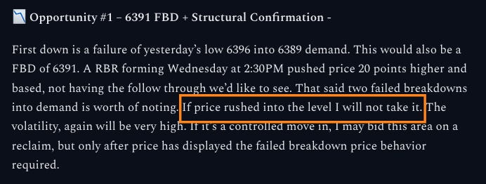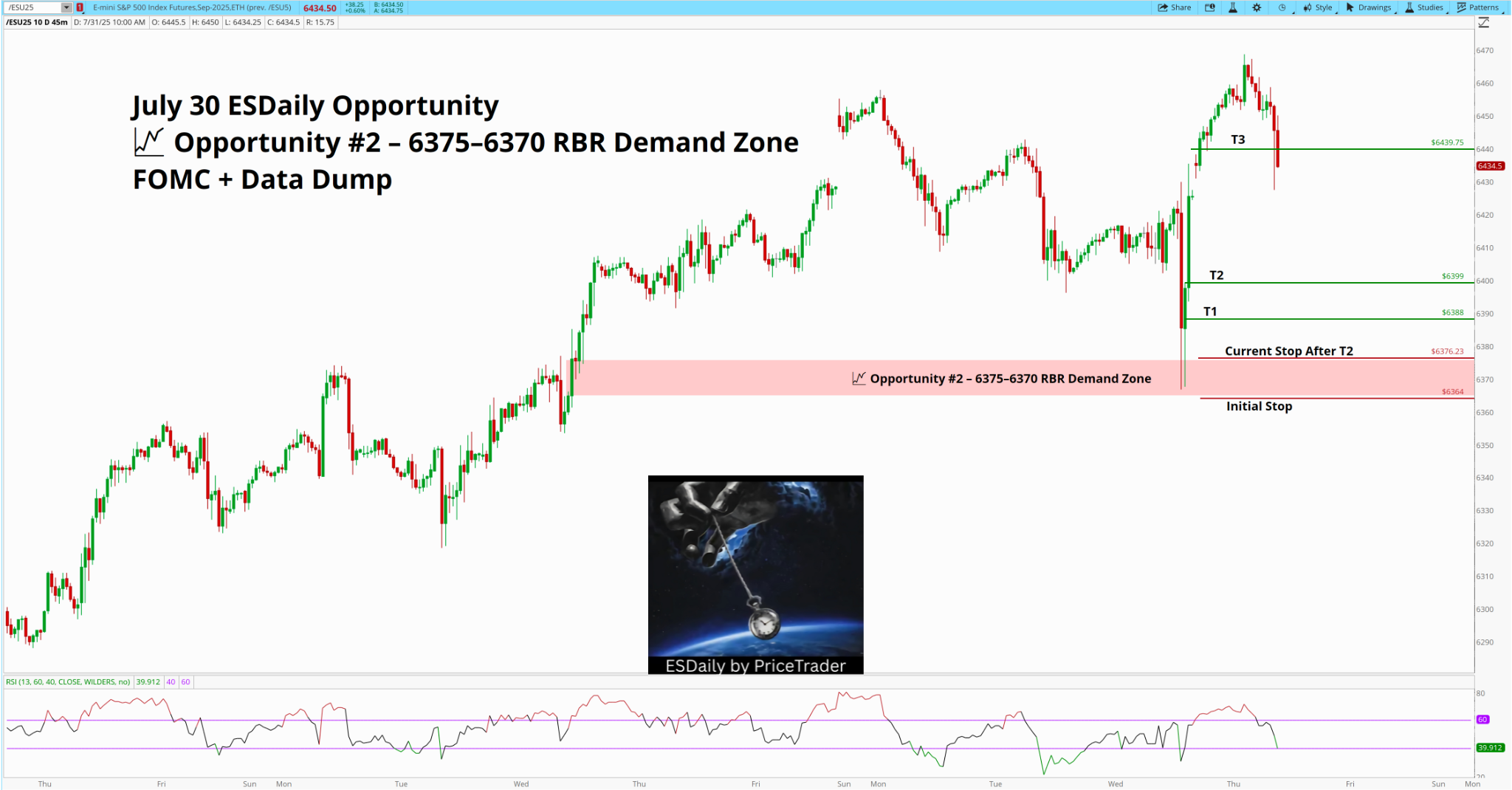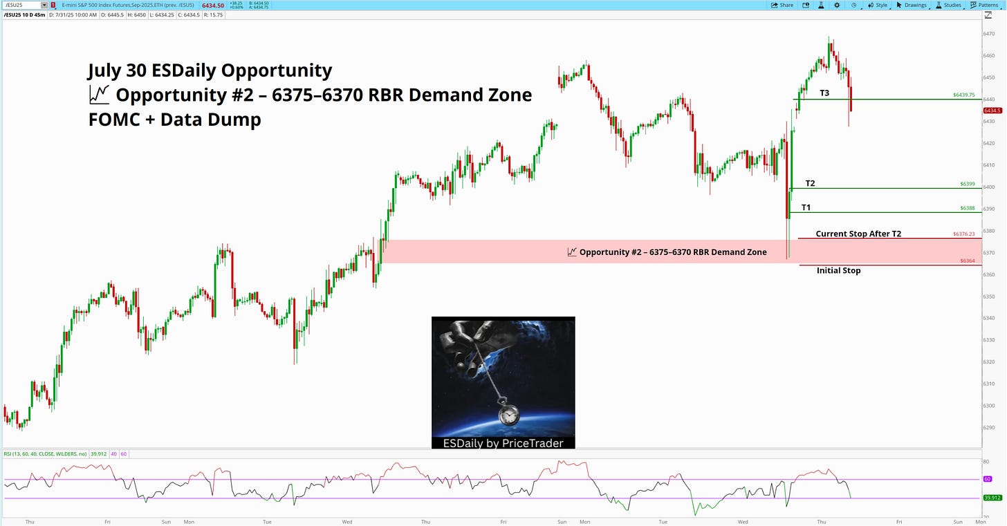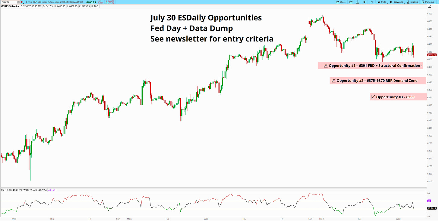 Formed by Monday July 21st 12:15 PM high — exact level of Wednesday July 23 stall — this RBR is a clean structural zone where resistance became support. It launched the breakout that turned into last week’s expansion. It’s untested and fresh. A flush into 6375–6370 with 15-min RSI bottoming and divergence could offer the first high-probability revisit. Needs clean rotation — no slow grind. Prefer reclaim setup, not a passive bid unless reaction is aggressive and obvious. This is a great setup, but today isn’t normal. Same thing as the note above: If it’s a controlled move in, I may bid this area on a confirmation, but only after price offers behavior that suggest it’s the end of the move down.