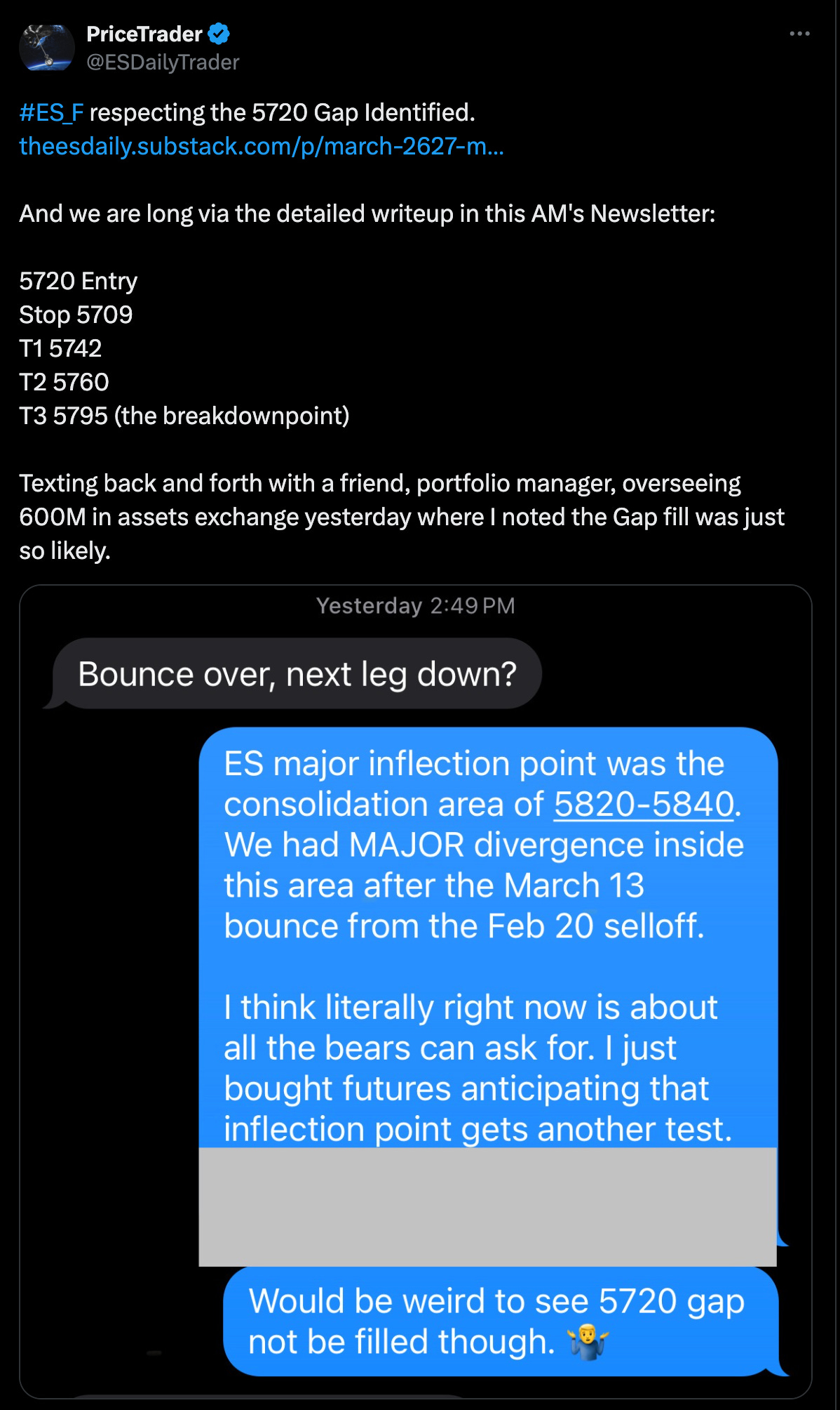 Likely Supports For 3/27 are: “..5721(D <B and Gap Closure). 5720 Gap closure is a big deal here for ES Bulls. The absolute lowest bulls want to see is the gap fill from Sunday which is now down at 5720.”