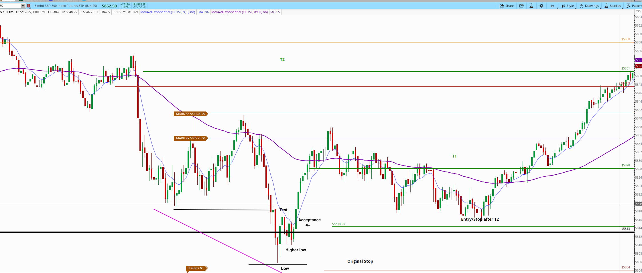 Upon the flush, we had the divergence into yesterday’s 5810 support, acceptance occurred, and we formed a reversal pattern. Reclaim confirmed and we were filled at 5314.25