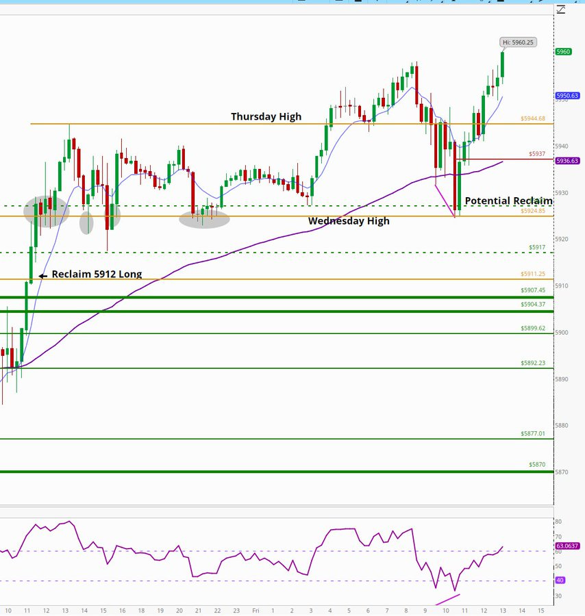 After rallying from 5729 — a reclaim I didn’t take but noted (explained below) — ES ripped as high as 5977.50. But, the last hour of the session told the real story.