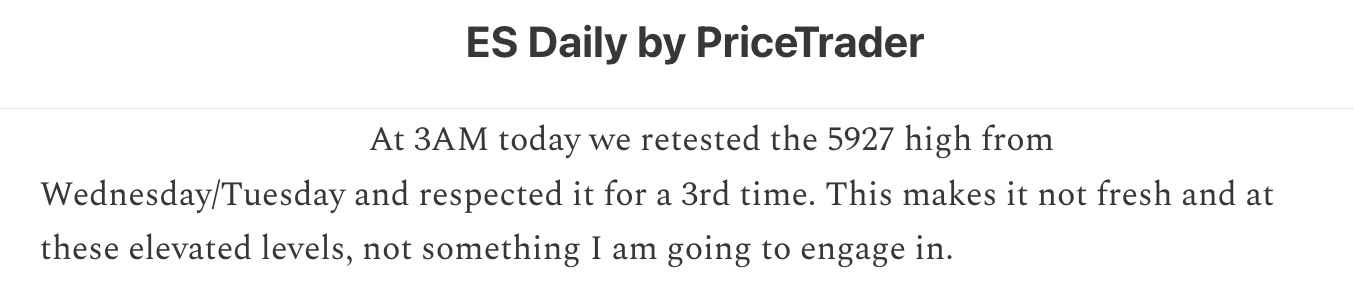 When you get this many warning signs — divergence, failed highs, sentiment hitting extremes — and the market still squeezes, that’s your cue to stop pressing. I felt like I’d be pressing by taking 5927 on it’s 4th attempt.