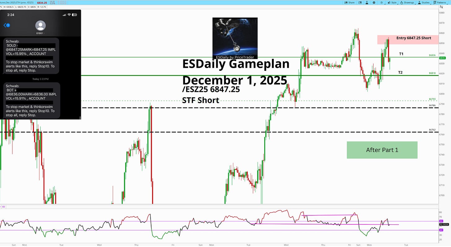 As soon as ES pushed into that band, the hesitation was obvious. Buyers tried. They stalled. They backed off. And once the rejection showed its hand, the short at 6847.25 was simply the next step.