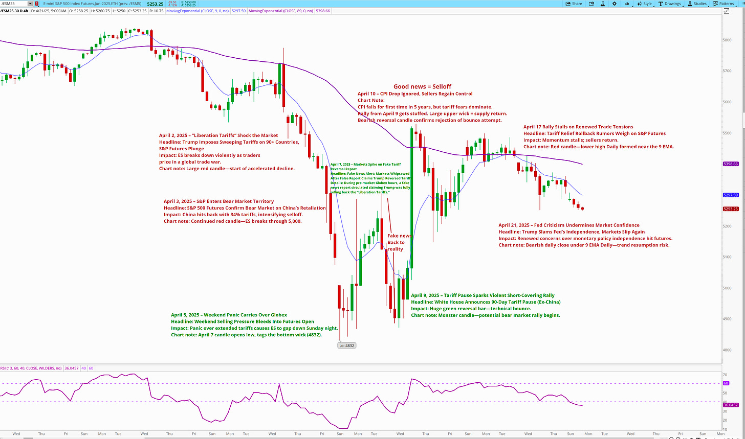 From April 2 to April 9, ES drops nearly 400 points, then bounces violently, only to give back gains again. If you’re not securing partial profits during those outsized moves—even countertrend bounces—you’re setting yourself up for heartbreak. The system — It removes emotion when volatility hits.
