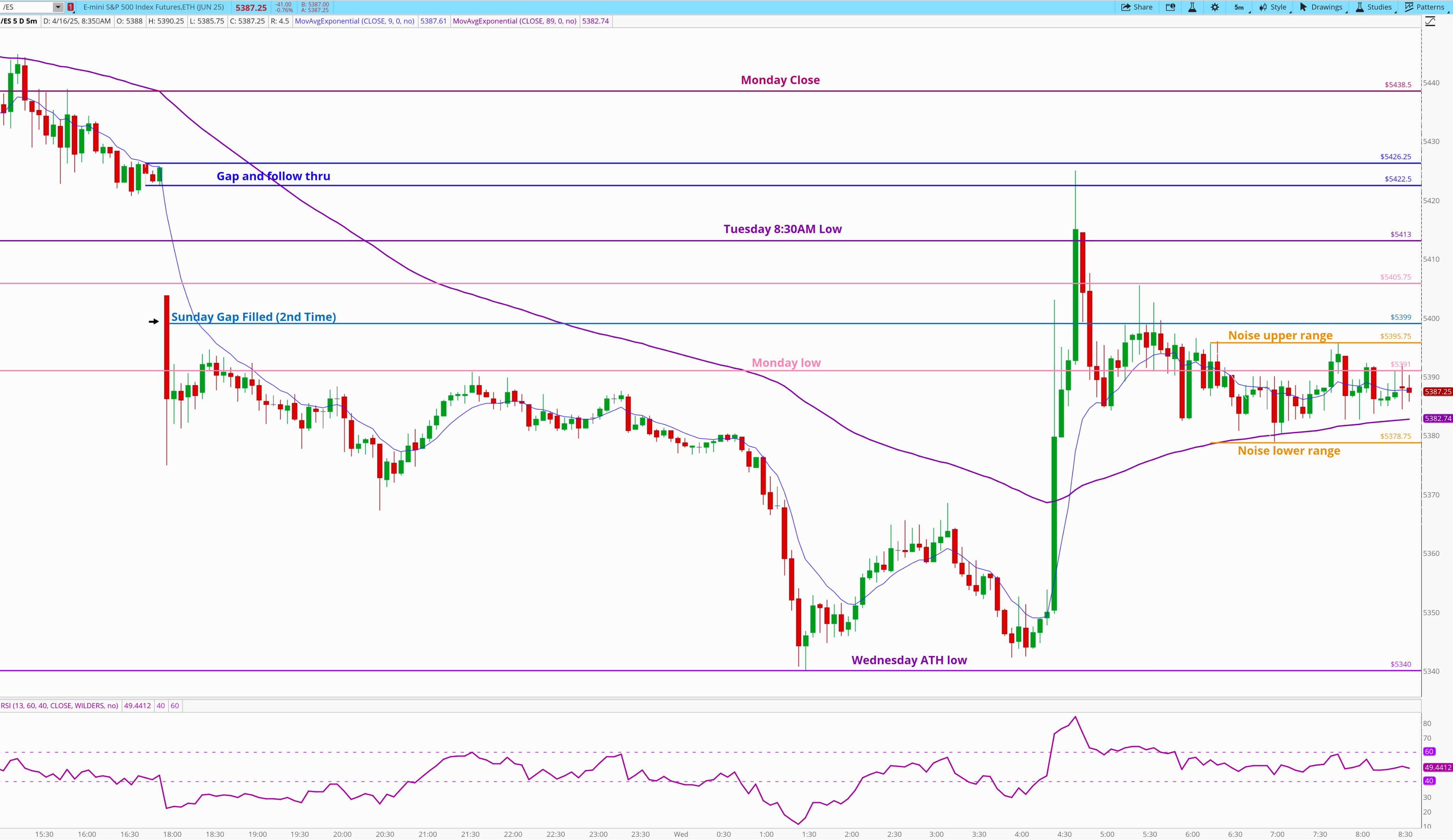 Remember: Noise State: Most of the time, ES is stuck in what I call the Noise State. This is the default mode of the market—price chops, traps, fakes, and resets. It doesn’t trend cleanly. It oscillates. One moment we’re bouncing off a low, then we’re running two levels higher, then we stall, fade, rally again—and by the close, we’re right back where we started. Maybe. That’s the game in the Noise State. It’s a market in negotiation—no clear winner, just back-and-forth indecision. We don’t get to pick the size of the range. We don’t get clarity. We get movement that feels like momentum but rarely follows through. This is the norm.After the 80 point pop at 4:25AM we went no where.