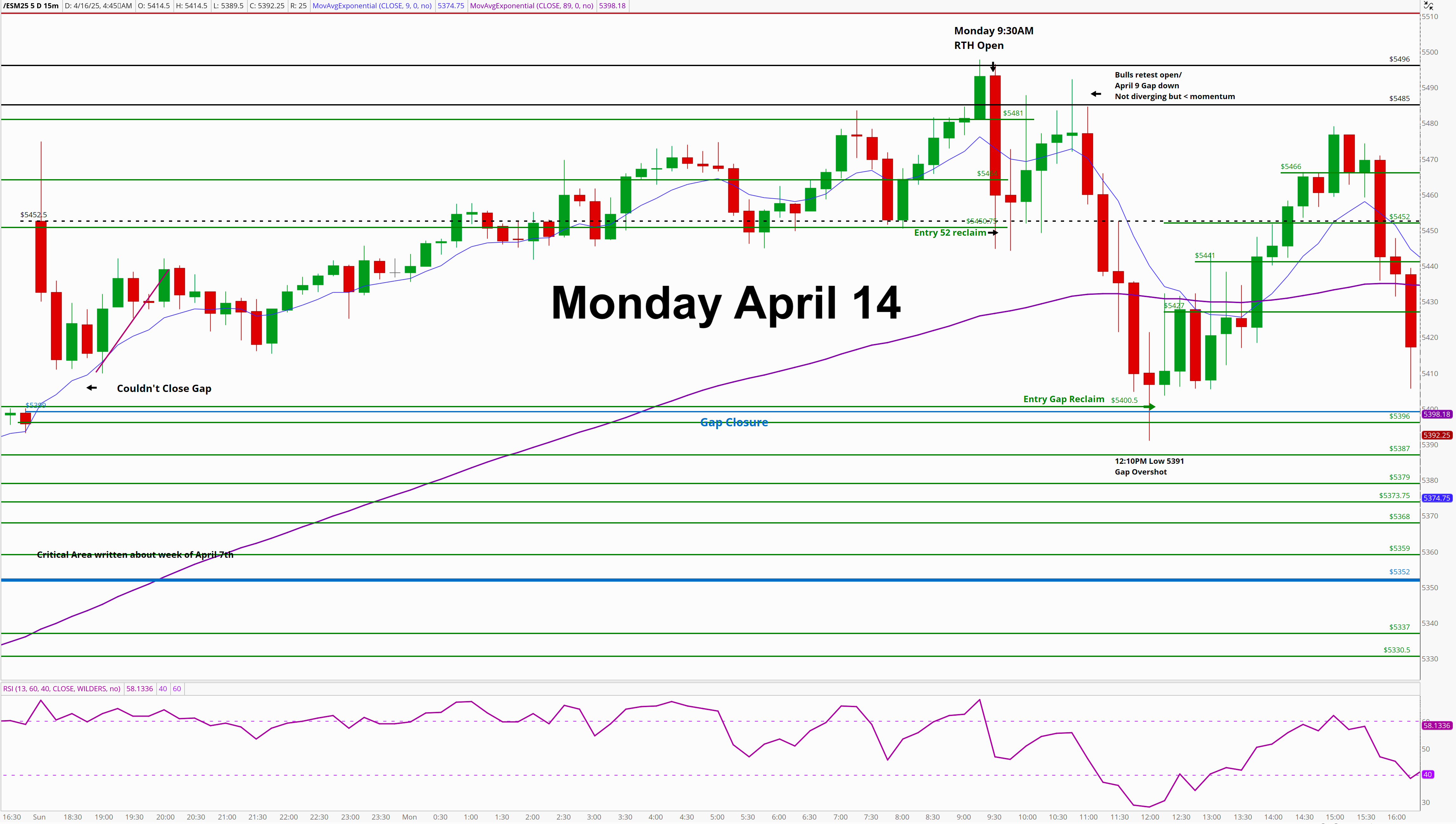 Then sold off 5410 in the first hour of trading. By 7PM EST Sunday, April 13th, we bottomed but we failed to close the gap at 5399.
