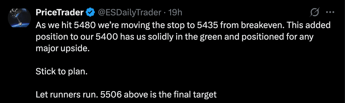 We continued to seek the top end of the range quickly at 5480. I announced I was moving my stop to 5435.