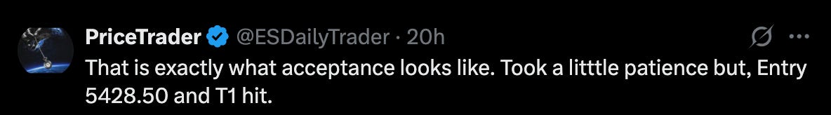 Once acceptance was complete, we initiated the trade and we were filled at 5428.50. In a quick order (like we should if a reclaim is a true reclaim) we moved to T1 at 37 and I wrote this