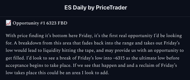 “📈 Opportunity #1 6323 FBD – A breakdown under Friday’s low into ~6315 followed by a reclaim could offer a clean entry.”