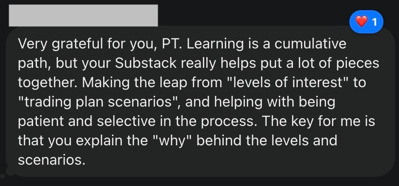 PT, I think it would be great if you made some short videos explaining this and other trade reviews. I think if you first explain what the trade setup/conditions/targets were, then show how you managed the trade live, that would be educational and attractive to people. Can use as a way to cross-market the substack.