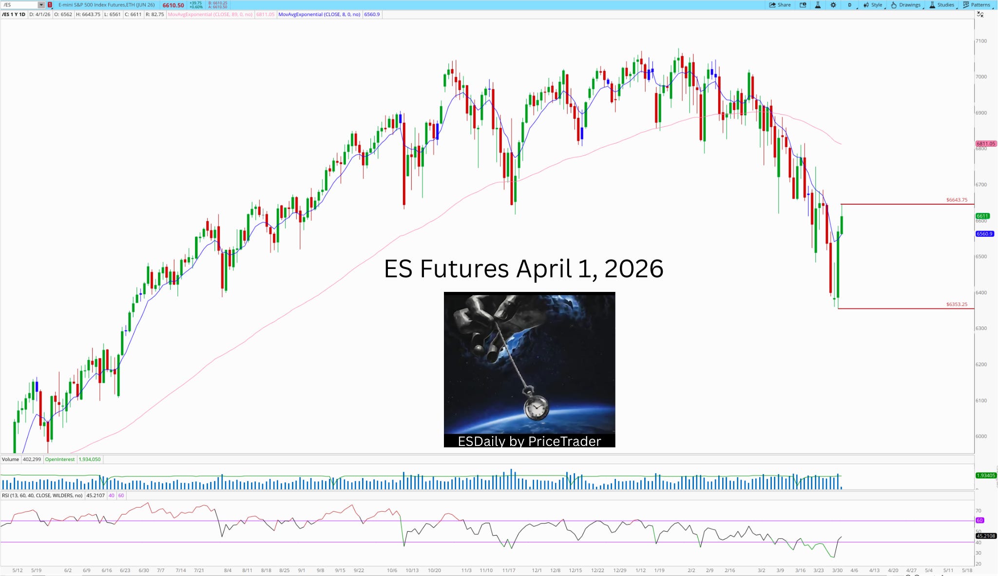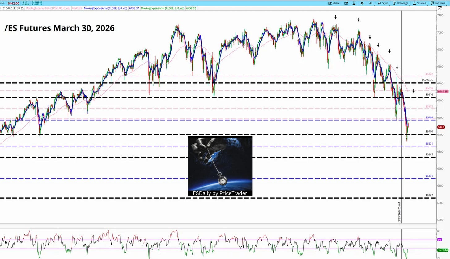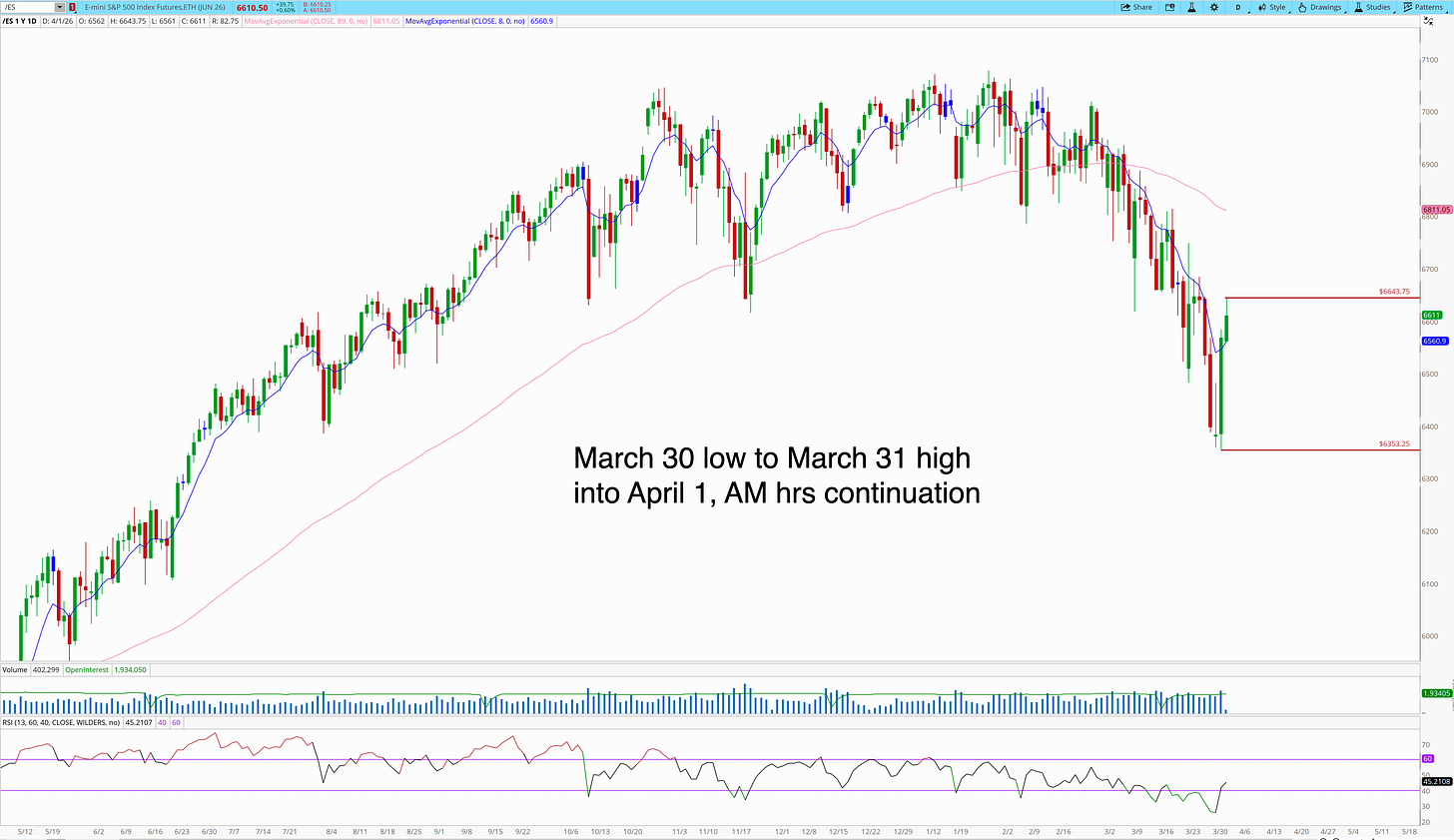 Yesterday, March 31, ES rallied from 6353 on March 30 and closed at 6567. Overnight into April 1, it traded as high as 6643.